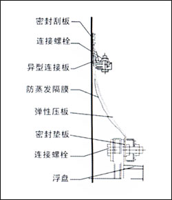 二次密封主要有彈性壓板、異型連接板、防蒸發隔膜以及耐油、耐氣候老化、耐磨的復合橡膠密封刮板組成。它能有效的防止油氣泄漏,阻擋雨水、風沙向罐內滲入,以能隨浮盤升降運行自如而不發生翹曲;防蒸發隔膜具有良好的防油所蒸發滲透,它整條地環繞在浮盤與罐壁的環行窨上,外部受彈性壓板保護,能將一次密封泄漏的油氣與大氣空間有效的隔離。 |